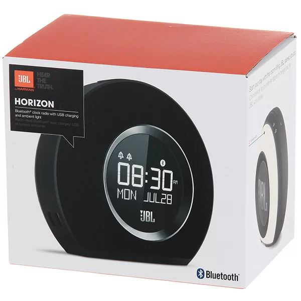 В Horizon встроены два независимых будильника. Просыпаться можно благодаря трём предустановленными сигналами, FM приемнику, музыке на вашем телефоне или традиционному сигналу будильника. JBL Horizon предлагает пять программируемых пресетов FM радио, а также может передавать музыку без проводов с любого телефона или планшета с поддержкой Bluetooth. Компактный дизайн позволит разместить устройство в любом помещении, оно прекрасно впишется в любой интерьер. Два USB порта обеспечивают быструю зарядку любых подключенных устройств. Большая кнопка Snooze/Light в сочетании с четким ЖК-дисплеем делает использование JBL Horizon очень простым и понятным, а встроенная система резервного питания гарантирует, что вы всегда будете просыпаться, даже во время отключения электроэнергии.